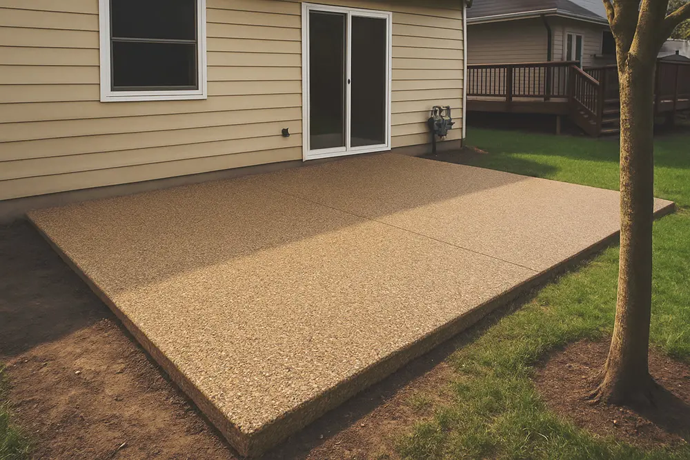 Sand finish concrete (also called sand washed concrete) comes in a wide range of natural color options. These tones will blend well with your landscaping scheme, lending a soil-like look to your patio. When concrete is sand finished, it can take on a smooth, classy veneer. A classic look.